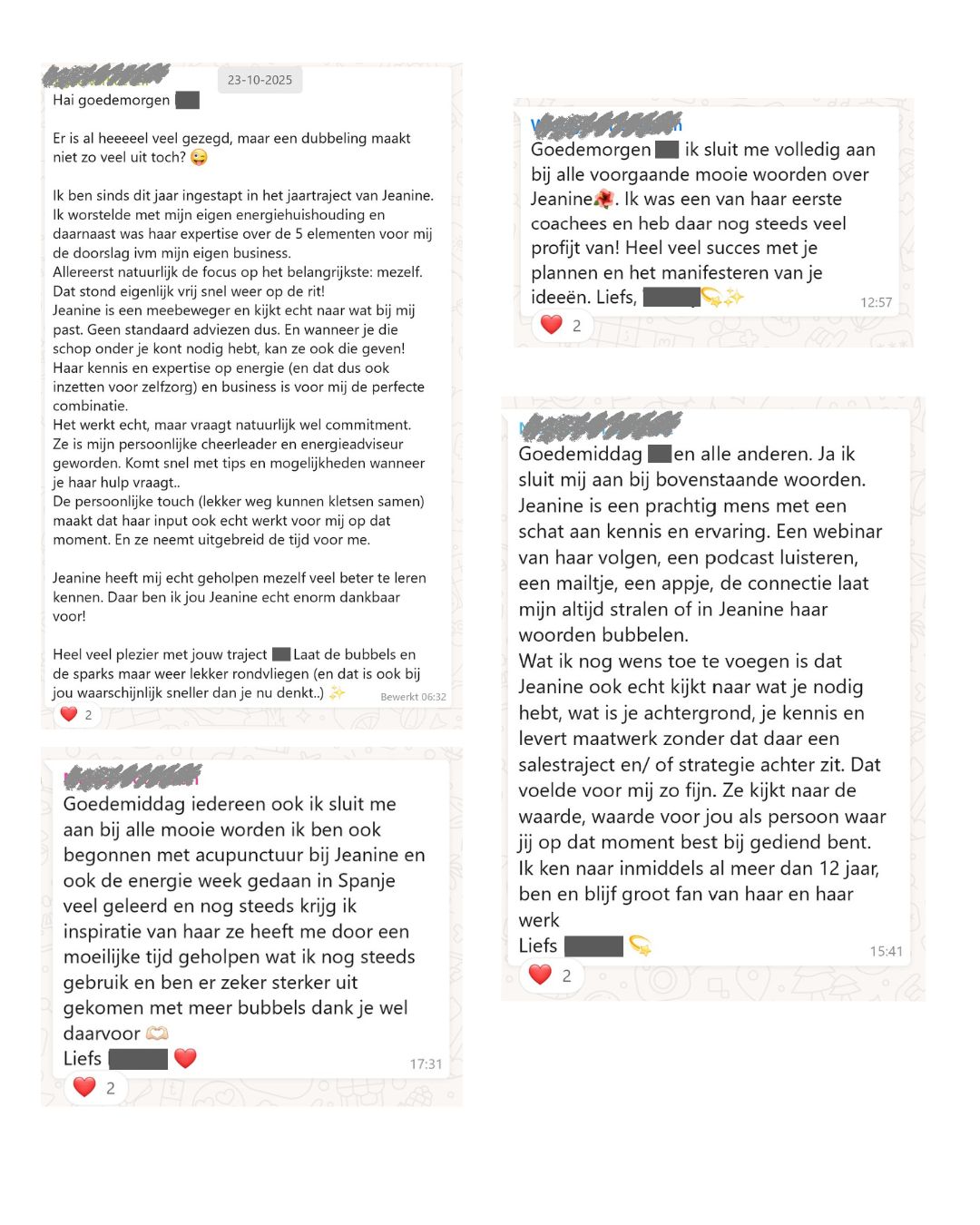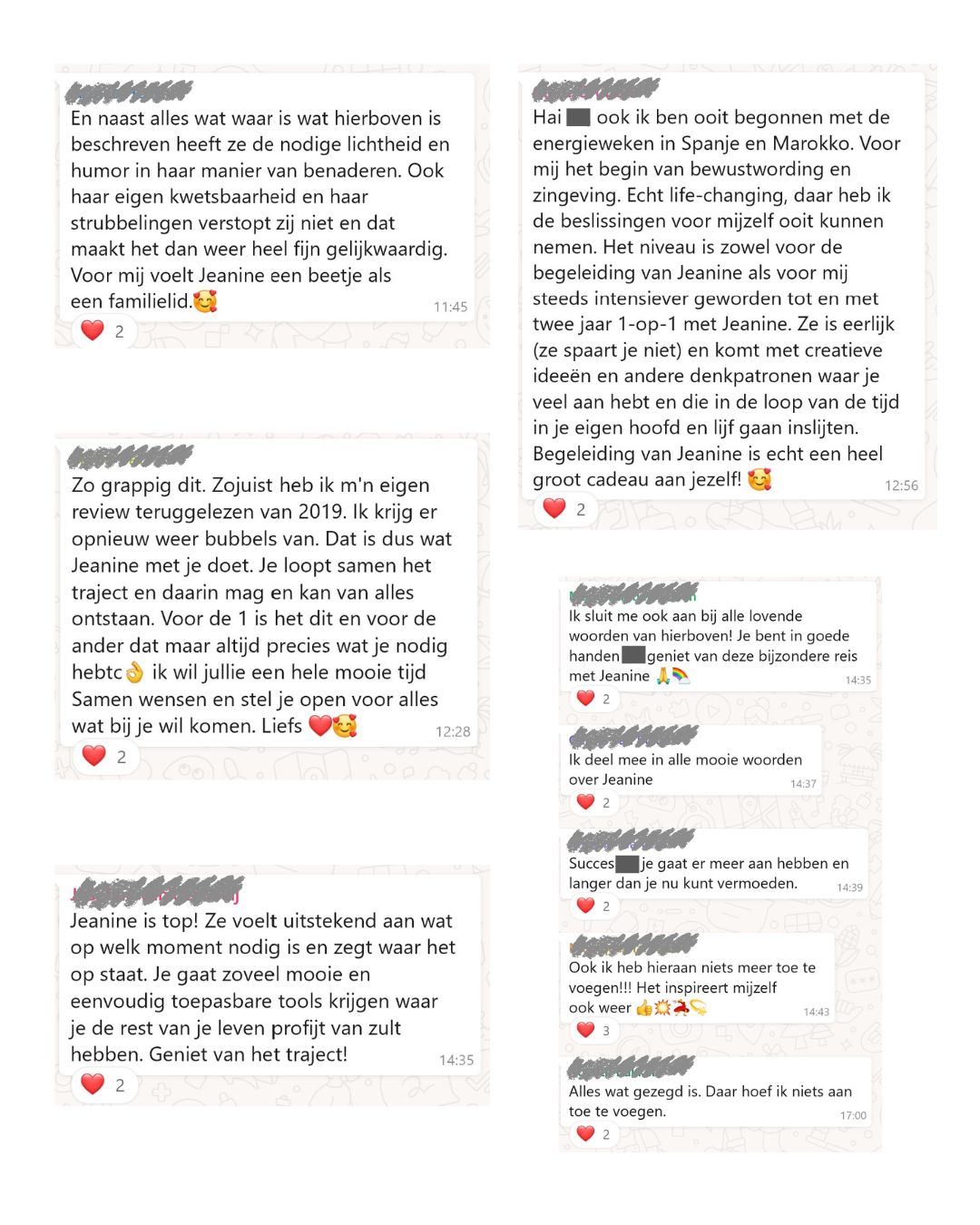 Daarnaast zijn er 8 groepscoaching sessies waarin ik vragen beantwoord en extra verdieping geef. Deze zijn ook om de week en worden ook live opgenomen en in de leeromgeving geplaatst.
